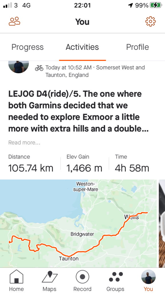 The 5 th hurdle was both our Garmins going off piste – mine lost the route entirely for some reason, Hisham’s kept saying do a U turn back to the roadworks (ALL BAD , VERY BAD) . Ended up taking a circular up and down and up and down route through some pretty Exmoor villages but adding an extra 400 m climbing , before deciding to follow any signpost to Taunton . 10 miles from Taunton Hisham’s Garmin kicked in again . I reset mine in Taunton .