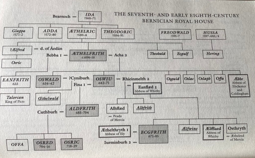 We then came to Beadnell Village and sidestepped the path for a few hundred yards to visit St Ebbas church, built c 1740, and dedicated to St Ebba (Aebbe) sister of Oswald (see right hand side of family tree below)