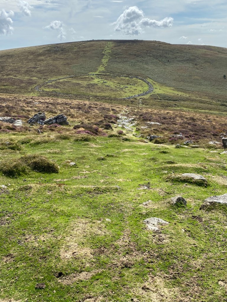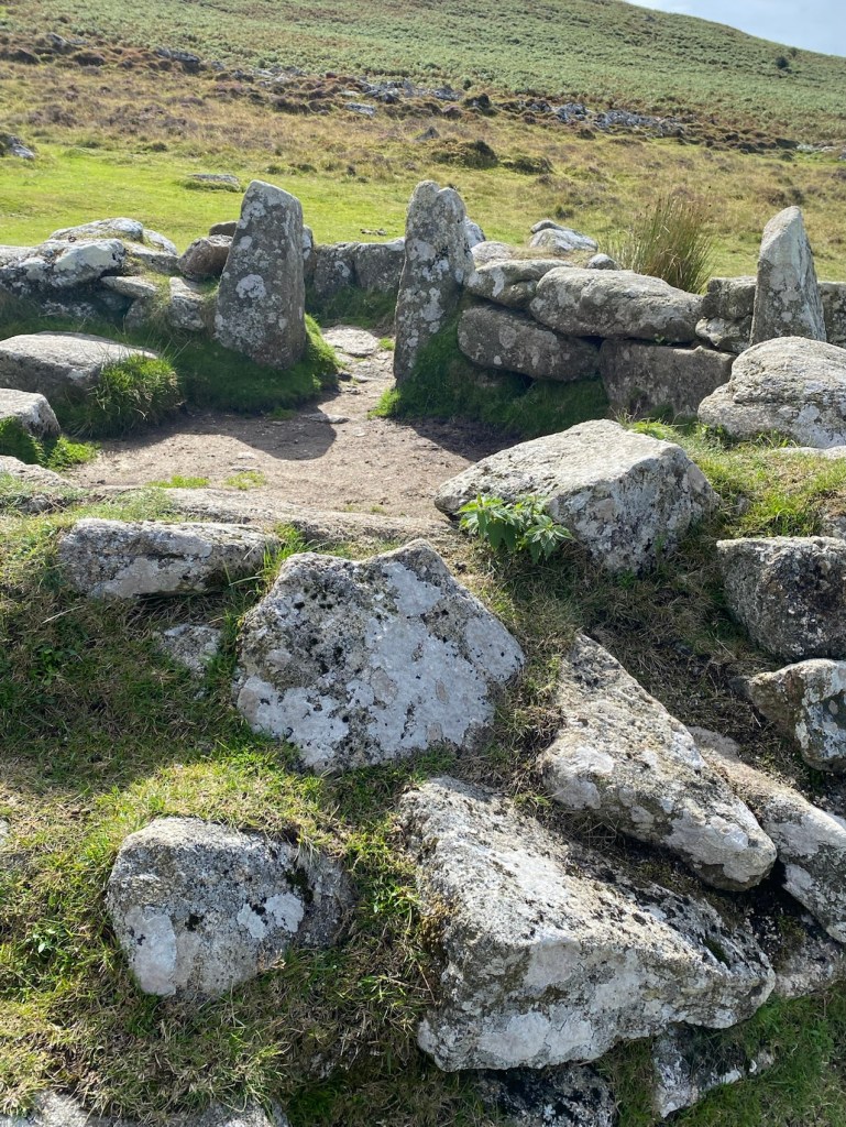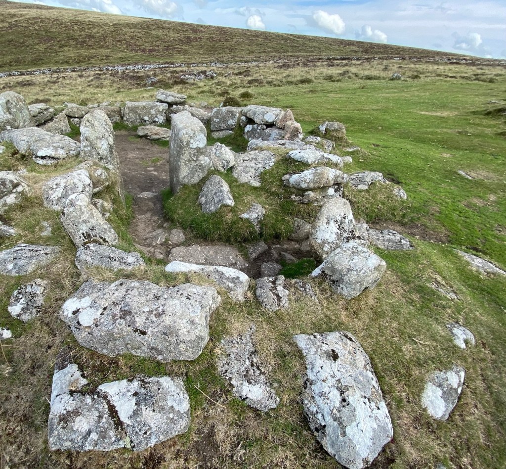 Onward… to the Bronze Age settlement of Grimspound dating from around 1300BC. A knowledgeable local walker gave us a bit of low down on it as we were gazing at the layout. Apparently the stone huts had two layers of wall filled in with moss and earth (good insulation), and porches or entrance corridors that kept the wind out. You could easily make these out.